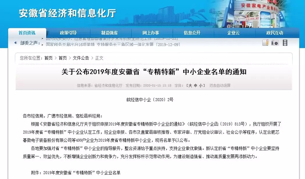2019年安徽省新認(rèn)定安徽心里程等500戶企業(yè)為“專精特新”中小企業(yè)