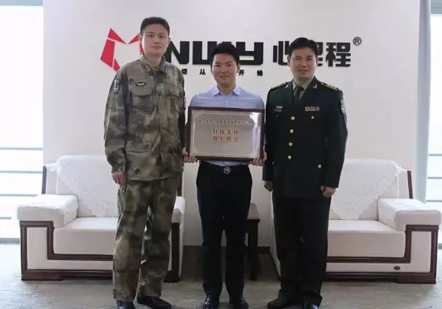 廣東省陸軍預(yù)備役防化團(tuán)團(tuán)長劉俊生、政委劉常山蒞臨心里程控股集團(tuán)總部,授予心里程控股集團(tuán)“科技先鋒、擁軍模范”,并贈予心里程集團(tuán)董事長彭國遠(yuǎn)榮譽證書。