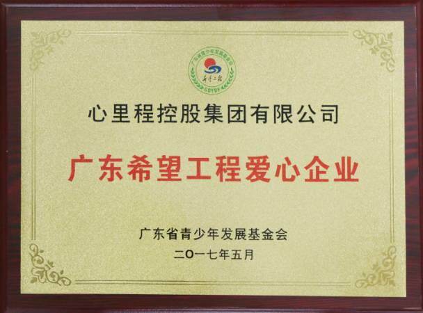 2017年5月【廣東省青少年發(fā)展基金會】授予【廣東心里程控股集團(tuán)】廣東希望工程愛心企業(yè)的稱號。