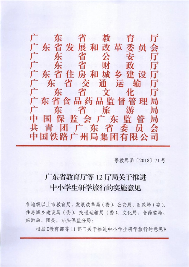 廣東省教育廳等12廳局關(guān)于推進(jìn)中小學(xué)生研學(xué)旅行的實(shí)施意見