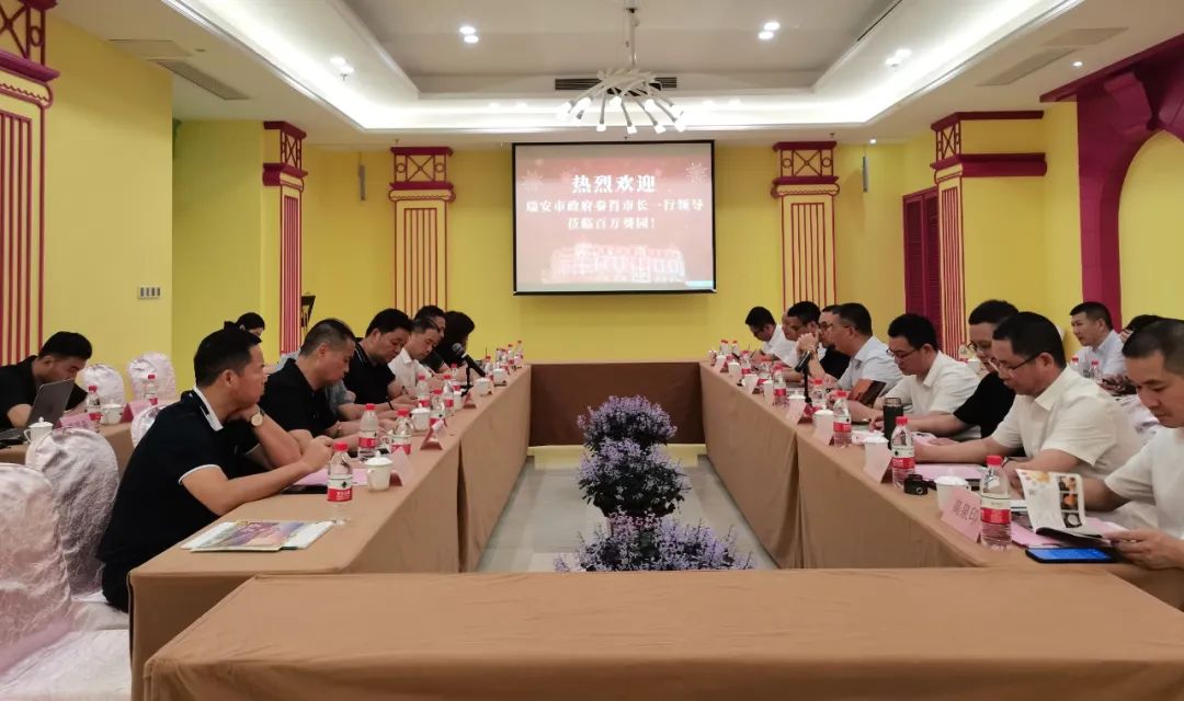 8月19日,浙江省溫州市瑞安市委副書記、市長秦肖,瑞安市委常委、市政府黨組成員林朝進(jìn),瑞安市副市長陳鵬等領(lǐng)導(dǎo)赴廣州考察香港百萬葵園集團(tuán)并召開洽談會,洽談文旅項目招引事宜。香港百萬葵園集團(tuán)有限公司董事長馬輝熱情接待考察團(tuán)一行。心里程控股集團(tuán)副董事長、廣東心里程產(chǎn)業(yè)投資集團(tuán)董事長彭俏奇受邀參加洽談會。