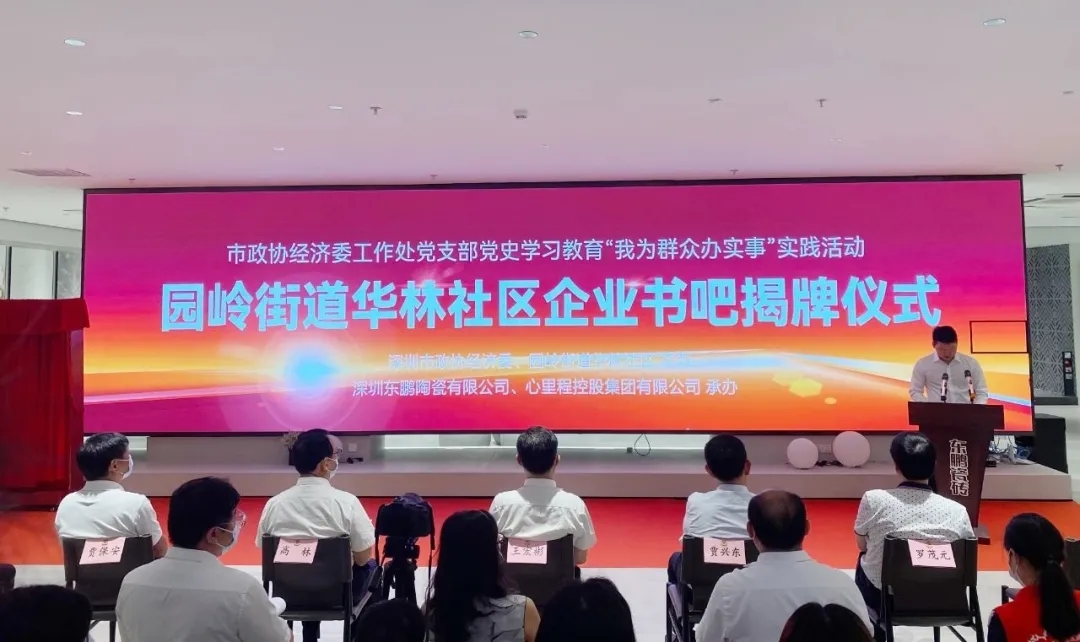 9月2日,由深圳市政協(xié)經(jīng)濟(jì)委、園嶺街道華林社區(qū)主辦,深圳東鵬陶瓷有限公司、心里程控股集團(tuán)承辦的“我為群眾辦實(shí)事”園嶺街道華林社區(qū)企業(yè)書(shū)吧揭牌儀式在通泰大廈東鵬瓷磚展廳舉行。