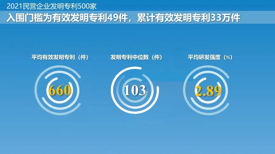報(bào)告透露,“2021民營企業(yè)研發(fā)投入500家榜單”入圍門檻為上年度研發(fā)投入2.37億元。500家企業(yè)研發(fā)費(fèi)用總額7429億元,其中,研發(fā)投入最高的企業(yè)研發(fā)費(fèi)用1419億元。“2021民營企業(yè)發(fā)明專利500家榜單”入圍門檻為擁有有效發(fā)明專利49件。500家企業(yè)累計(jì)擁有有效發(fā)明專利33萬件,其中,有效發(fā)明專利最多的企業(yè)共擁有9萬件發(fā)明專利。