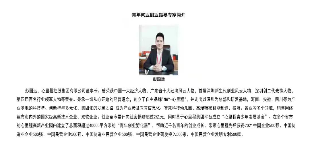 彭國(guó)遠(yuǎn)董事長(zhǎng)于2007年開始回國(guó)創(chuàng)業(yè),在上海注冊(cè)第一家公司,自留學(xué)歸國(guó)創(chuàng)業(yè)至今已有15年,擁有豐富的創(chuàng)業(yè)經(jīng)驗(yàn)與閱歷,成熟穩(wěn)定的創(chuàng)業(yè)思維。早在2020年的時(shí)候就被聘為“全國(guó)人才流動(dòng)中心高校畢業(yè)生就業(yè)創(chuàng)業(yè)指導(dǎo)專家”,并且曾應(yīng)邀參加人社部就業(yè)促進(jìn)司、全國(guó)人才流動(dòng)中心和青海省人社廳聯(lián)合在青海民族大學(xué)舉辦高校畢業(yè)生就業(yè)創(chuàng)業(yè)指導(dǎo)進(jìn)校園活動(dòng),為廣大畢業(yè)生作題為《在新時(shí)代創(chuàng)業(yè),需要注意什么》的專題講座;受邀到香港理工大學(xué)參加“創(chuàng)新、創(chuàng)業(yè)、創(chuàng)未來”交流會(huì),與廣大師生分享自己創(chuàng)業(yè)以來的心路歷程及經(jīng)驗(yàn)。