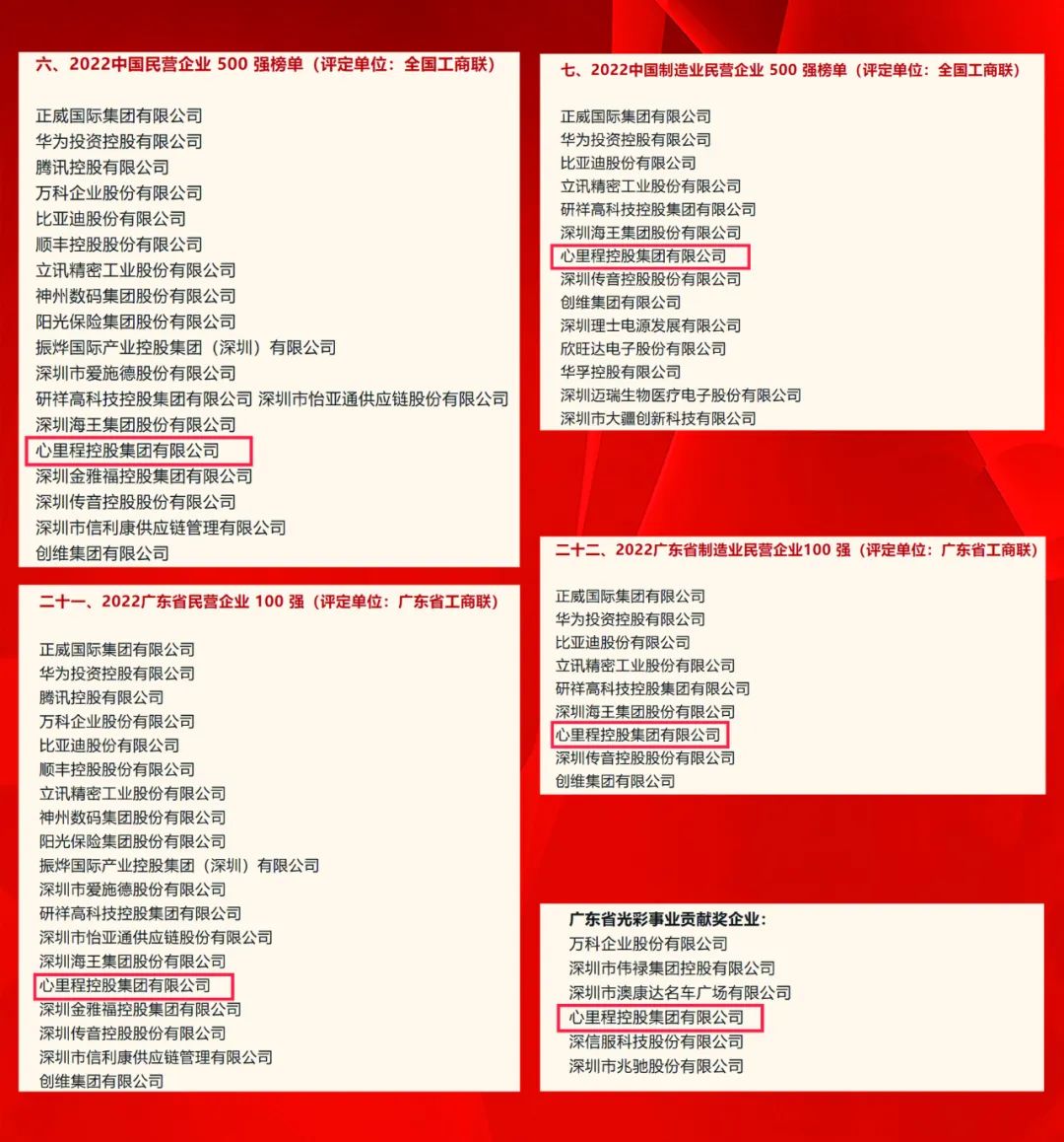 2022年是心里程集團碩果累累的一年,同年,心里程集團還榮登了“2022中國企業(yè)500強”榜單第370位、“2022中國制造業(yè)企業(yè)500強” 榜單第182位、“中國民營企業(yè)研發(fā)投入500家”榜單第96位、“中國民營企業(yè)發(fā)明專利500家”第107位、“2022廣東企業(yè)500強”榜單第61位、“2022深圳企業(yè)500強”榜單第29位。