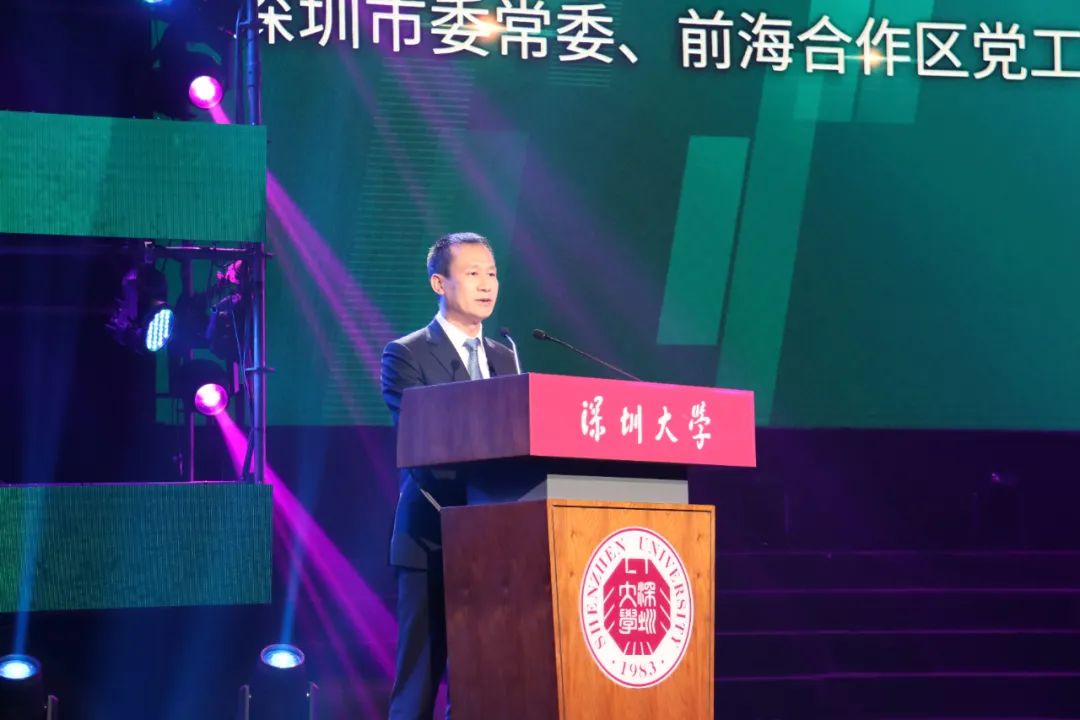 4月27日,深圳大學(xué)40周年校慶捐贈儀式暨“海岸之聲”音樂晚會在該校麗湖校區(qū)至?xí)丑w育館隆重舉行。 深圳大學(xué)杰出校友、深圳市委常委、前海合作區(qū)黨工委書記、南山區(qū)委書記曾湃,深圳大學(xué)黨委書記李清泉,深圳大學(xué)校長、中國科學(xué)院院士毛軍發(fā)等領(lǐng)導(dǎo),以及杰出校友代表、企業(yè)界代表、師生代表共1400余人參加儀式。副校長李永華主持捐贈儀式。心里程集團董事長彭國遠受邀出席活動并代表集團捐資1億元。