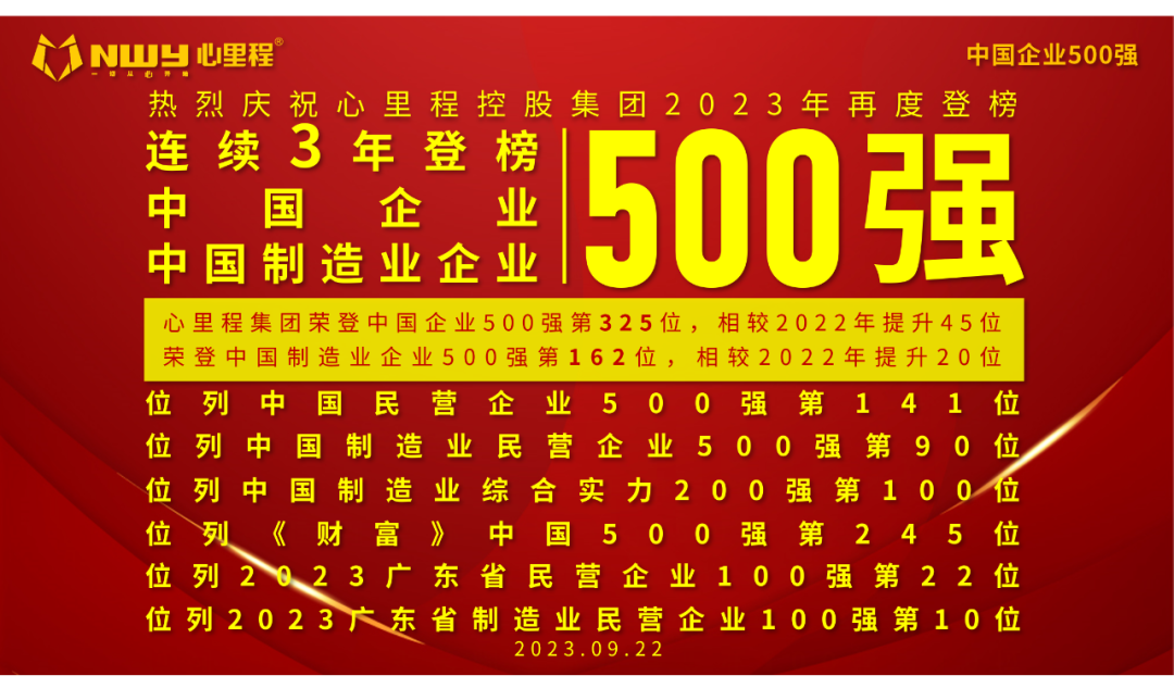 近期,心里程集團(tuán)可謂喜事連連,捷報(bào)頻傳。集團(tuán)先后榮登“2023中國(guó)企業(yè)500強(qiáng)”榜單第325位,較去年上升45位;“2023中國(guó)制造業(yè)企業(yè)500強(qiáng)”榜單第162位,較去年上升20位;“2023年中國(guó)民營(yíng)企業(yè)500強(qiáng)”榜單第141位,較去年上升29位;“2023年中國(guó)制造業(yè)民營(yíng)企業(yè)500強(qiáng)”榜單第90位,較去年上升13位;“2023年中國(guó)制造業(yè)綜合實(shí)力200強(qiáng)”榜單第100位;“2023年《財(cái)富》中國(guó)500強(qiáng)”榜單第245位;“2023廣東省民營(yíng)企業(yè)100強(qiáng)”榜單第22位,較去年提升5位;“2023廣東省制造業(yè)民營(yíng)企業(yè)100強(qiáng)”榜單第10位,較去年提升2位;“2023深圳企業(yè)500強(qiáng)”榜單第27位。