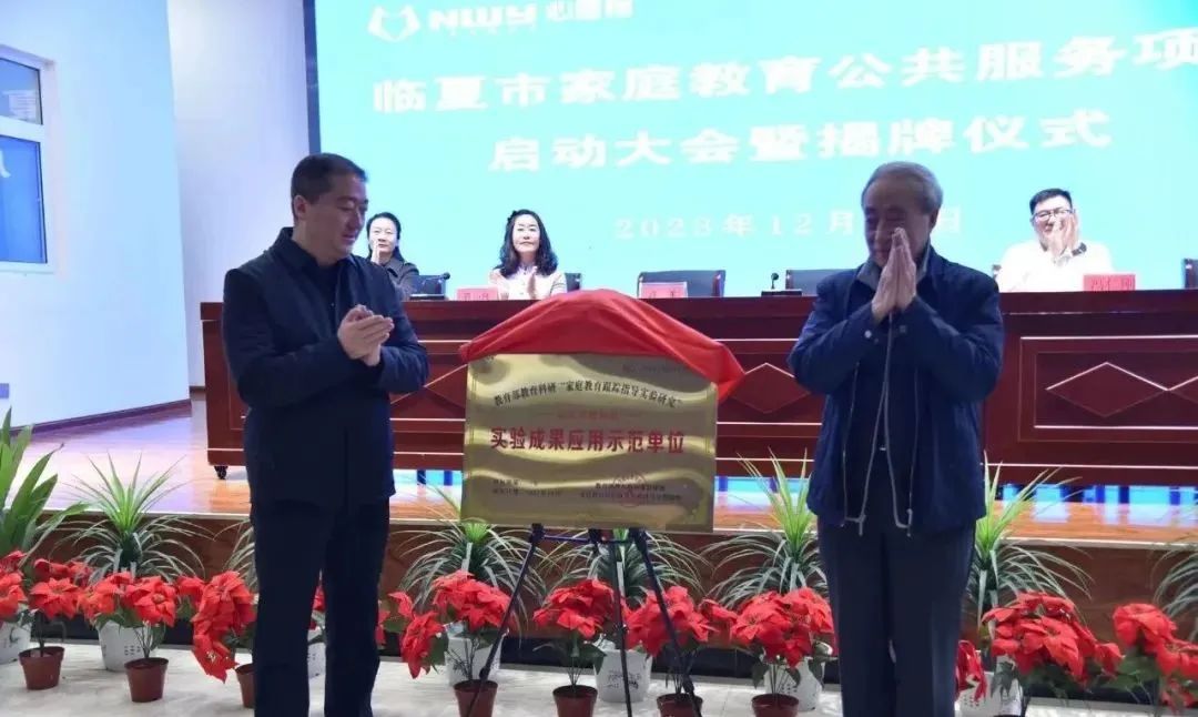 致辭過(guò)后,孫一鳴院長(zhǎng)宣讀了教育部教育科研規(guī)劃課題組批復(fù)函,國(guó)家教育部原基礎(chǔ)教育司司長(zhǎng)、國(guó)家副總督學(xué)王文湛,市委常委、宣傳部部長(zhǎng)許洋共同為臨夏市家庭教育公共服務(wù)項(xiàng)目揭牌。