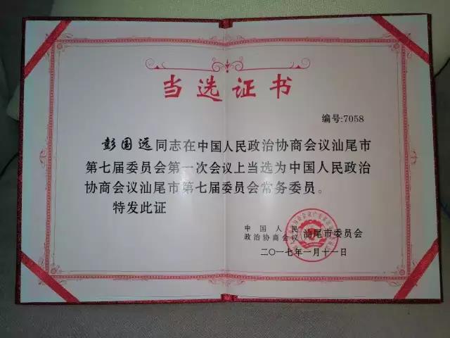 彭國遠(yuǎn)董事長榮獲汕尾市委員會(huì)榮譽(yù)證