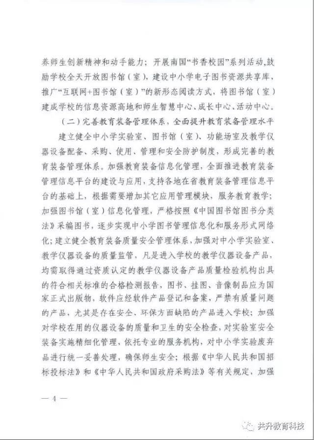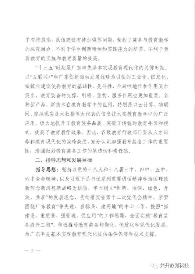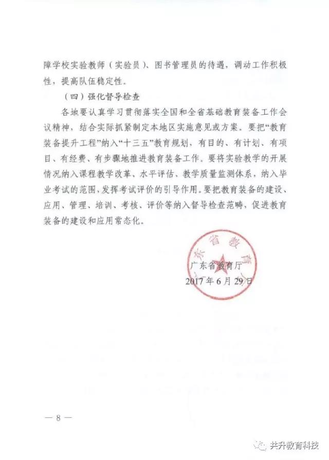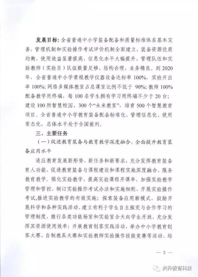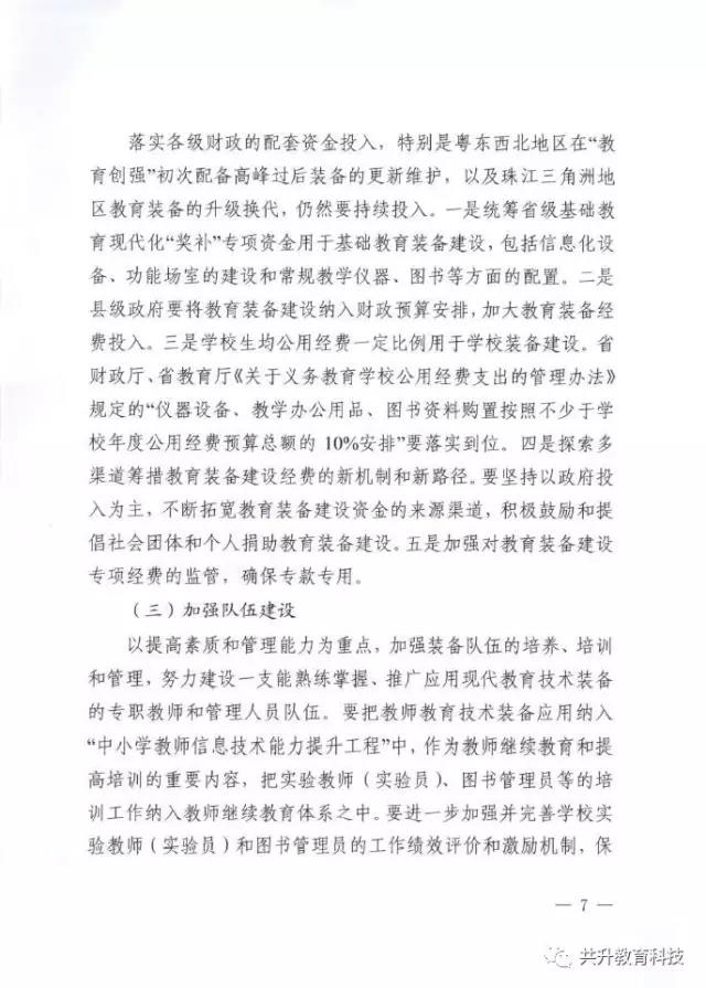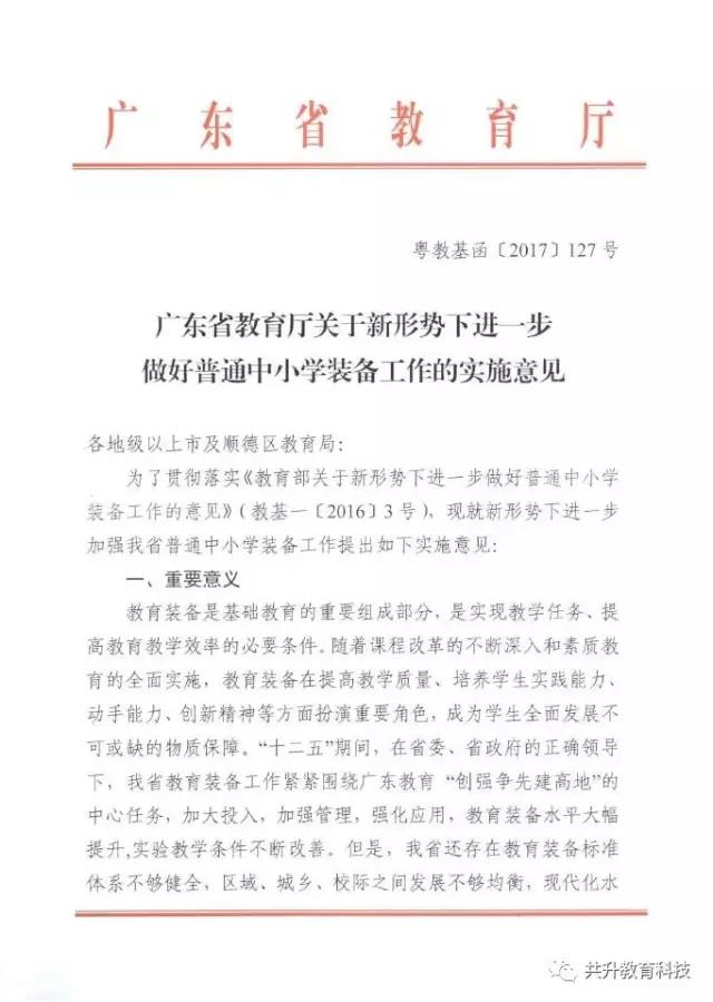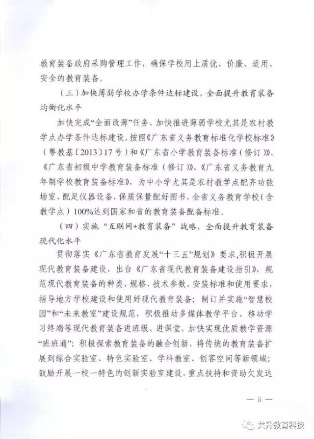 廣東省教育廳于6月29日正式下發(fā)《廣東省教育廳關(guān)于新形勢下進(jìn)一步做好普通中小學(xué)裝備工作的實(shí)施意見》(粵教基函【2017】127號),實(shí)施意見發(fā)展目標(biāo)為:全省普通中小學(xué)裝備配備和質(zhì)量標(biāo)準(zhǔn)體系基本完善,管理機(jī)制和實(shí)驗(yàn)操作考試評價機(jī)制全面建立,裝備資源優(yōu)質(zhì)均衡,使用效益顯著提高,信息化水平大幅提升,管理隊伍和實(shí)驗(yàn)教師(實(shí)驗(yàn)員)隊伍數(shù)量足夠、結(jié)構(gòu)合理、業(yè)務(wù)精良。到2020年,全省普通中小學(xué)常規(guī)教學(xué)儀器設(shè)備達(dá)標(biāo)率100%,實(shí)驗(yàn)開出率100%,網(wǎng)絡(luò)多媒體教室占總課室比例不低于90%,教師100%配備教學(xué)用終端,每100名學(xué)生擁有學(xué)習(xí)用終端不低于20臺,建設(shè)100所智慧校園、300個未來教室,培育500個智慧教育項(xiàng)目。全省普通中小學(xué)教育裝備標(biāo)準(zhǔn)化、管理信息化、使用常態(tài)化,總體水平處于全國前列。(以下為文件內(nèi)容)