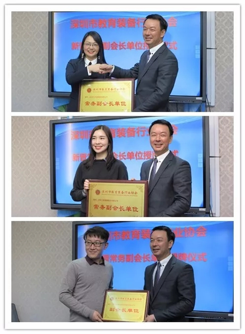 會(huì)后,在王富會(huì)長(zhǎng)、夏國(guó)明副會(huì)長(zhǎng)兼秘書長(zhǎng)的見證下,彭錦環(huán)會(huì)長(zhǎng)/總裁為深圳市教育裝備行業(yè)協(xié)會(huì)新晉常務(wù)副會(huì)長(zhǎng)單位——深圳市眾投邦股份有限公司、深圳市大熊創(chuàng)新股份有限公司,副會(huì)長(zhǎng)單位——北京世紀(jì)超星信息技術(shù)發(fā)展有限責(zé)任公司進(jìn)行了授牌。