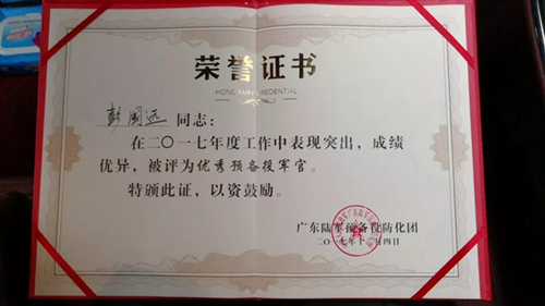 2016年,彭國(guó)遠(yuǎn)董事長(zhǎng)被編入中國(guó)人民解放軍廣東陸軍預(yù)備役。經(jīng)過組織的認(rèn)真考察,他成為了一名光榮的陸軍預(yù)備役軍官,這圓了他兒時(shí)綠色軍營(yíng)的夢(mèng)想。