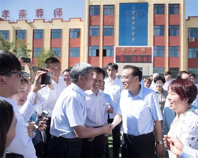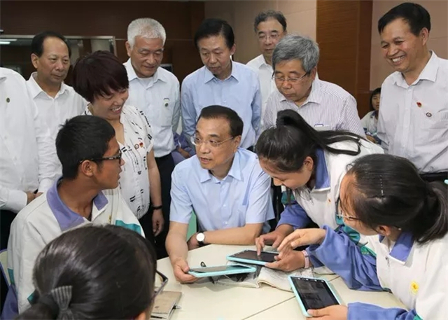 6月4日,李克強(qiáng)總理在寧夏銀川市永寧縣閩寧中學(xué)考察“互聯(lián)網(wǎng)+教育”發(fā)展?fàn)顩r。寧夏通過打造教育資源公共服務(wù)平臺,全區(qū)中小學(xué)?;ヂ?lián)網(wǎng)接入率已達(dá)到100%。在該校的“智慧教室”,學(xué)生們?nèi)耸忠粋€(gè)平板電腦,向總理展示上面集成的優(yōu)質(zhì)教育課件和彼此分享的學(xué)習(xí)心得。