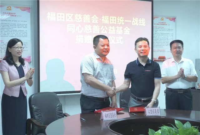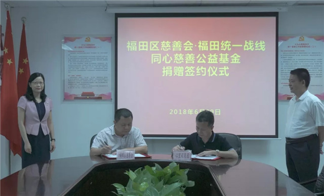 啟動(dòng)儀式開始前,在福田區(qū)委常委、統(tǒng)戰(zhàn)部長(zhǎng)劉俊琳,福田區(qū)委統(tǒng)戰(zhàn)部常務(wù)副部長(zhǎng)朱亞銘,福田區(qū)民政局副局長(zhǎng)呂凡,福田區(qū)慈善會(huì)秘書長(zhǎng)楚天等領(lǐng)導(dǎo)的見證下,彭俏奇董事長(zhǎng)與福田區(qū)慈善會(huì)會(huì)長(zhǎng)莊儒平正式簽署捐贈(zèng)協(xié)議。