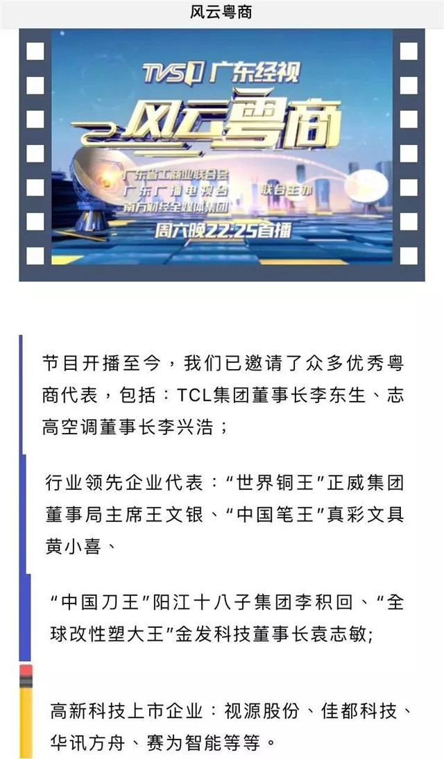 開播至今,《風(fēng)云粵商》已邀請到眾多優(yōu)秀粵商代表,包括:TCL集團(tuán)董事長李東生、志高空調(diào)董事長李興浩;行業(yè)領(lǐng)先企業(yè)代表:“世界銅王”正威集團(tuán)董事局主席王文銀、“中國筆王”真彩文具黃小喜、“中國刀王”陽江十八子集團(tuán)李積回、“全球改性塑大王”金發(fā)科技董事長袁志敏;高新科技上市企業(yè):視源股份、佳都科技、華訊方舟、賽為智能;“獨角獸”企業(yè):云從科技等。