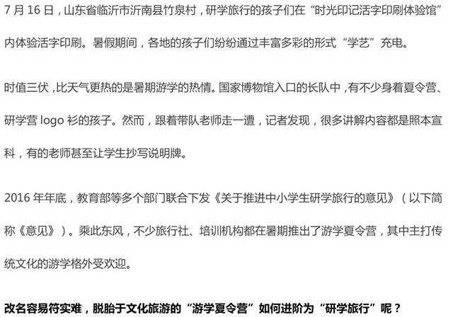但在北京市景山學(xué)校教師朱暢思看來,游學(xué)與研學(xué)并不能畫等號?!把袑W(xué)組織方應(yīng)有科學(xué)的邏輯,自己要設(shè)計活動、給孩子講解、帶著孩子們總結(jié)。否則,就只是個旅游、玩樂的組織者了。”