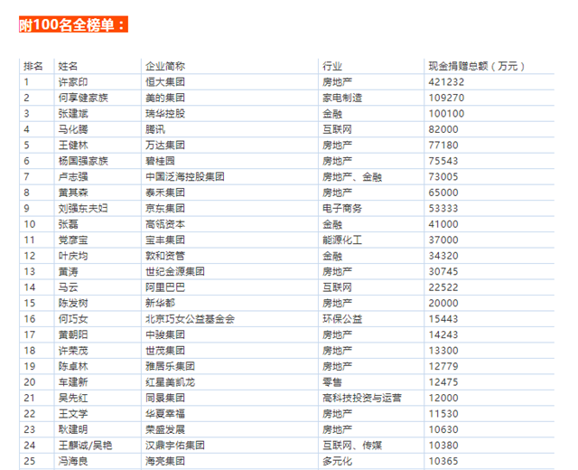 ▲“2015中國捐贈百杰榜”前20名