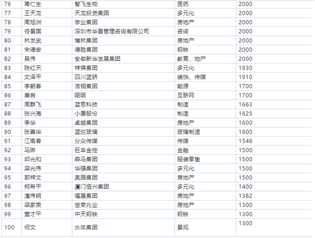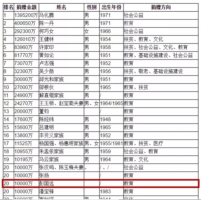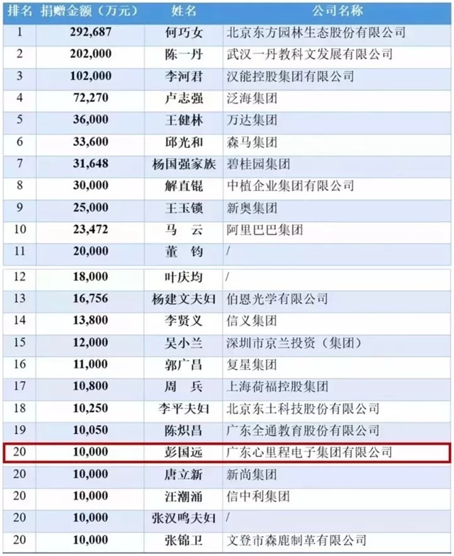 榜單上顯示,心里程控股集團(tuán)董事長彭國遠(yuǎn)以2000萬元的現(xiàn)金捐贈榮登慈善榜第75位。