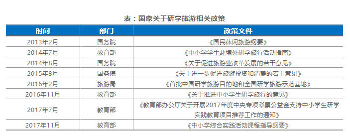 1、政策推動(dòng),研學(xué)旅游上升到國(guó)家戰(zhàn)略2016年11月,教育部聯(lián)合國(guó)家發(fā)改委、旅游局等11部門發(fā)布了《關(guān)于推進(jìn)中小學(xué)生研學(xué)旅行的意見》,《意見》明確指出,要將研學(xué)旅行納入中小學(xué)教育教學(xué)計(jì)劃,加強(qiáng)研學(xué)旅行基地建設(shè),并對(duì)組織管理、安全責(zé)任體系和經(jīng)費(fèi)籌措機(jī)制進(jìn)行了詳細(xì)闡述。研學(xué)旅行已由促進(jìn)旅游業(yè)發(fā)展的單一角度,上升到全面提高中小學(xué)生綜合素質(zhì)教育的國(guó)家戰(zhàn)略高度。