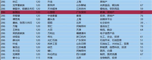 心里程控股集團(tuán)董事長彭國遠(yuǎn)以120億元榮登百富榜