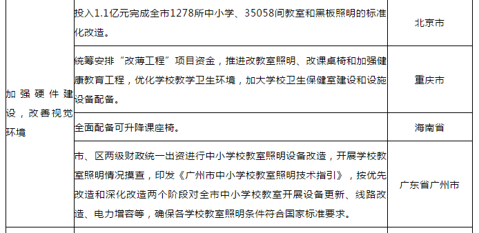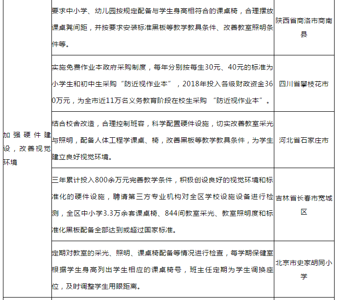 (四)加強(qiáng)硬件建設(shè),改善視覺(jué)環(huán)境。北京市、江西省、重慶市、河北省石家莊市、廣東省廣州市、陜西省商洛市商南縣、吉林省長(zhǎng)春市寬城區(qū)、北京市史家胡同小學(xué)等地方和學(xué)校加大財(cái)政投入,實(shí)施教室和黑板照明標(biāo)準(zhǔn)化改造,合理控制班容,確保各學(xué)校教室照明條件符合國(guó)家標(biāo)準(zhǔn)要求。配備可調(diào)節(jié)課桌椅,優(yōu)化學(xué)校教學(xué)衛(wèi)生環(huán)境。四川省攀枝花市投入360萬(wàn)元實(shí)施免費(fèi)作業(yè)本政府采購(gòu)制度,每年為11萬(wàn)小學(xué)生和初中生采購(gòu)“防近視作業(yè)本”。