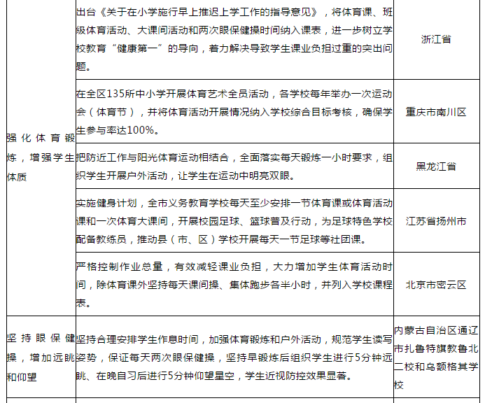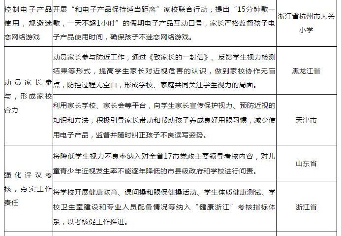 (五)減輕學(xué)業(yè)負(fù)擔(dān),緩解用眼壓力。黑龍江省、浙江省、北京市密云區(qū)等地通過(guò)推遲中小學(xué)生早晨入校時(shí)間,保障學(xué)生睡眠,嚴(yán)格控制作業(yè)總量,有效減輕課業(yè)負(fù)擔(dān)。