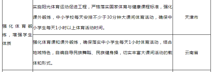 (三)強(qiáng)化體育鍛煉和戶外活動(dòng),增強(qiáng)兒童青少年體質(zhì)。黑龍江省、天津市、浙江省、云南省、江蘇省揚(yáng)州市、重慶市南川區(qū)等地結(jié)合地域特色,推進(jìn)陽(yáng)光體育運(yùn)動(dòng),嚴(yán)格落實(shí)國(guó)家體育與健康課程標(biāo)準(zhǔn),強(qiáng)化課外鍛煉,中小學(xué)校每天安排不少于30分鐘大課間體育活動(dòng),確保中小學(xué)生每天1小時(shí)以上體育活動(dòng)時(shí)間。