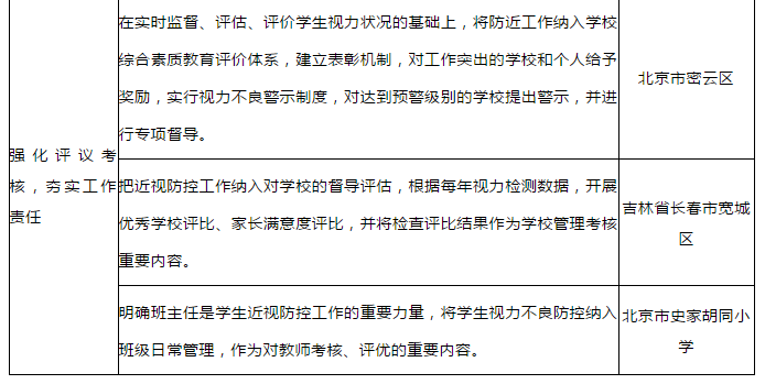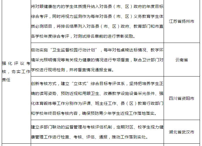 (九)強(qiáng)化考核督導(dǎo),夯實(shí)工作責(zé)任。山東省、浙江省、云南省、湖北省武漢市、江蘇省揚(yáng)州市、北京市密云區(qū)、四川省資陽(yáng)市、吉林省長(zhǎng)春市寬城區(qū)、北京市史家胡同小學(xué)等地方和學(xué)校將兒童青少年近視防控、降低學(xué)生視力不良率納入對(duì)地方黨政主要領(lǐng)導(dǎo)、教育行政部門、學(xué)校、班級(jí)和班主任考核內(nèi)容,對(duì)考核排名靠前的進(jìn)行表彰獎(jiǎng)勵(lì),對(duì)近視發(fā)生率不能降低的進(jìn)行通報(bào)和問(wèn)責(zé)。