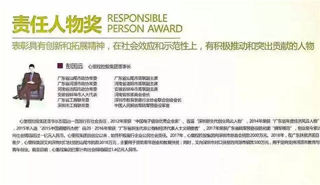 本次盛典分別設(shè)立了“責(zé)任行動(dòng)獎(jiǎng)”、“責(zé)任企業(yè)獎(jiǎng)”、“責(zé)任人物獎(jiǎng)”等重要獎(jiǎng)項(xiàng)。心里程控股集團(tuán)董事長(zhǎng)彭國(guó)遠(yuǎn)榮膺“責(zé)任人物獎(jiǎng)”。