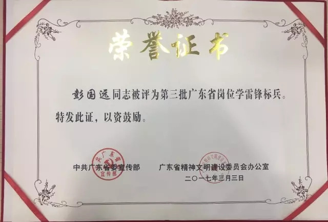 2017年榮獲“廣東學(xué)雷鋒標(biāo)兵”稱號(hào)