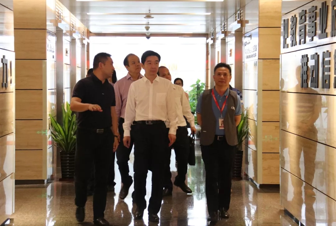 心里程投資集團董事長彭俏奇(右)、常務(wù)副總裁張玉(左)等領(lǐng)導(dǎo)陪同廣西貴港市副市長韋彥(中)參觀集團