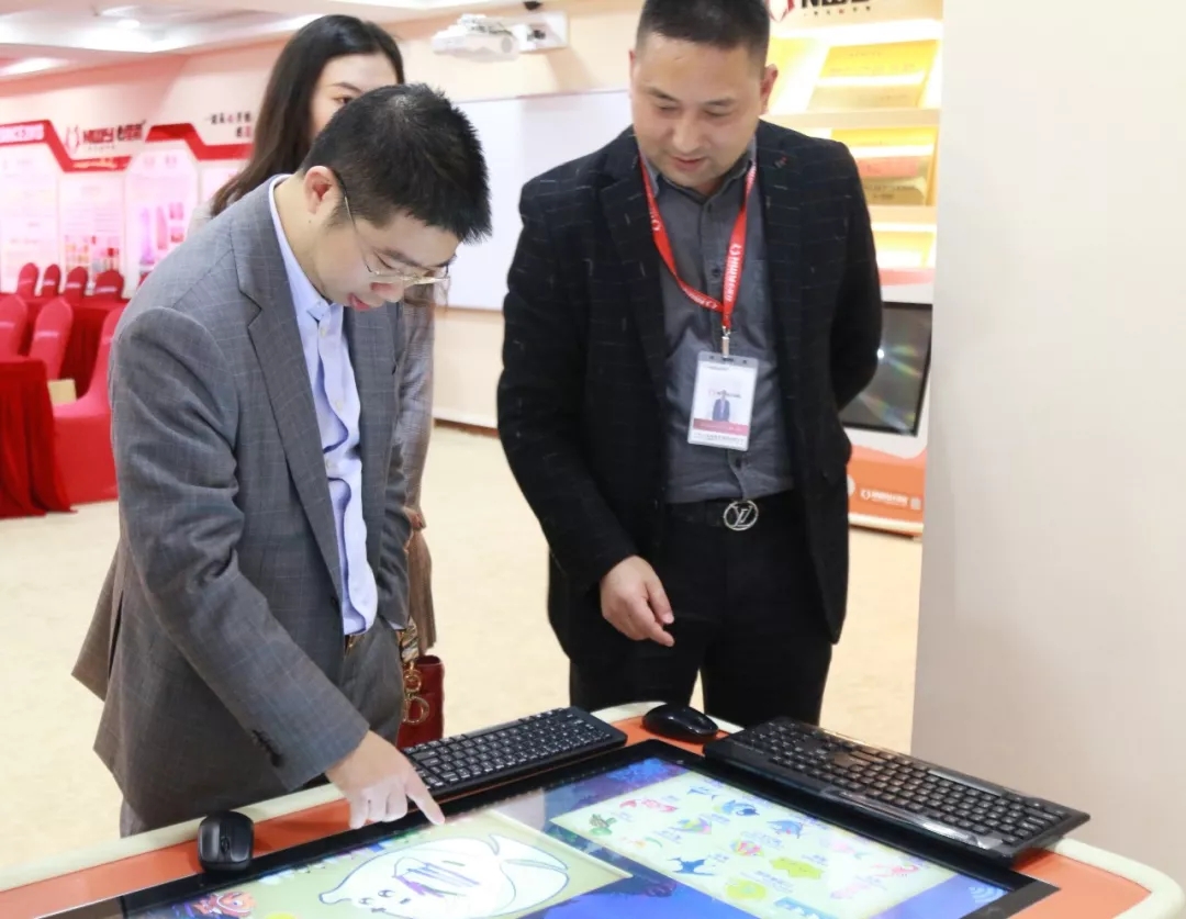 心里程投資集團(tuán)張玉常務(wù)副總裁(右一)陪同黃仕坤會長一行體驗(yàn)心里程幼教系列產(chǎn)品