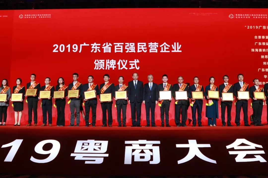 心里程集團(tuán)榮登“2019廣東省百強(qiáng)民營企業(yè)”榜單第41位彭國遠(yuǎn)董事長(右七)上臺(tái)接受頒獎(jiǎng),右八為陳良賢副省長