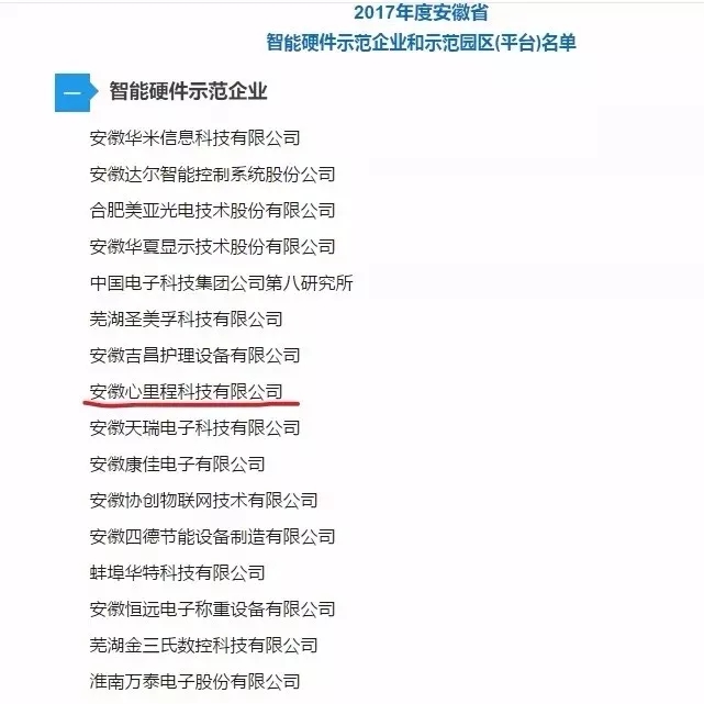 ●2017年,安徽心里程科技有限公司躋身2017年度安徽省智能硬件示范企業(yè)。