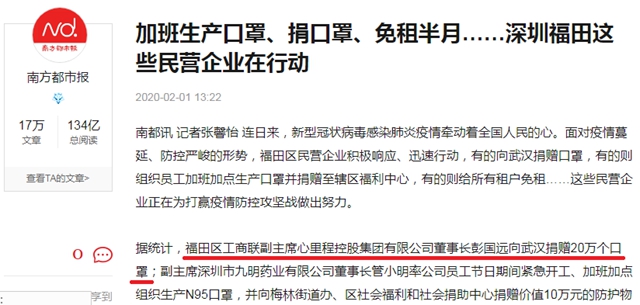 1月底,深圳市福田區(qū)工商聯(lián)副主席、心里程控股集團(tuán)有限公司董事長彭國遠(yuǎn)向武漢捐贈(zèng)口罩20萬個(gè)。