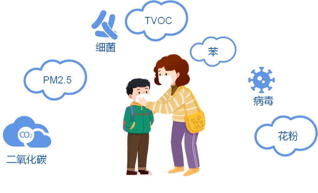 空氣中包含二氧化碳、甲醛、細菌、病毒、粉塵顆粒等大量有害物質影響師生的身心健康