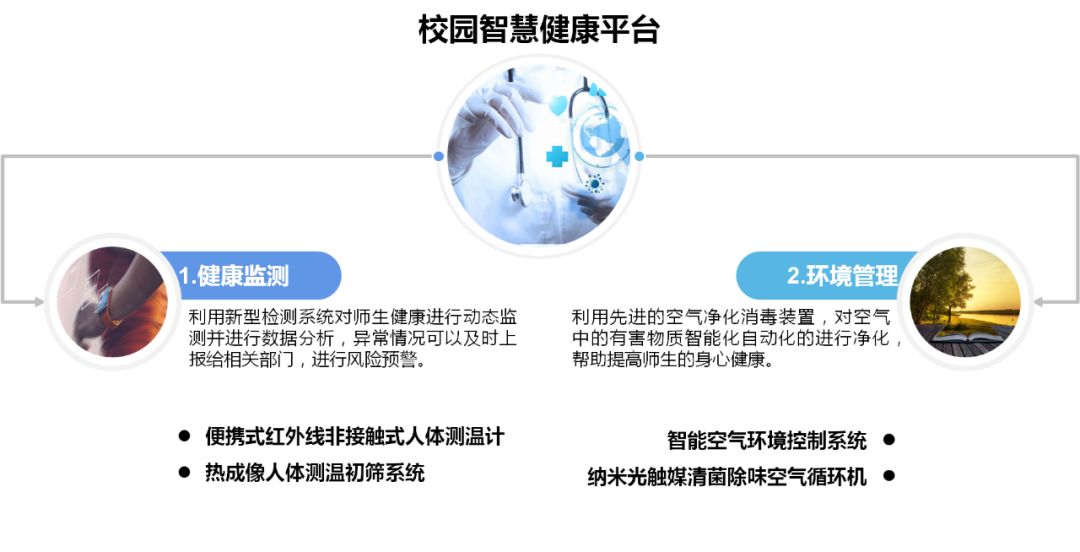 心里程智慧健康整體解決方案主要實現(xiàn)兩大平臺功能:1、健康監(jiān)測:利用新型檢測系統(tǒng)對師生健康進行動態(tài)監(jiān)測并進行數(shù)據(jù)分析,異常情況可以及時上報給相關部門,進行風險預警;2、環(huán)境管理:利用先進的空氣凈化消毒裝置,對空氣中的有害物質智能化自動化的進行凈化,幫助提高師生的身心健康。