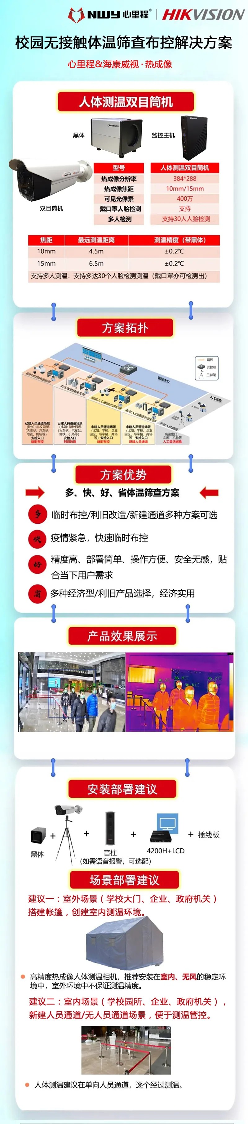 此次活動(dòng)捐贈(zèng)的產(chǎn)品,由心里程集團(tuán)攜手杭州??低晹?shù)字技術(shù)股份有限公司聯(lián)合出品,屬于非接觸式的新型檢測(cè)系統(tǒng),可對(duì)師生健康進(jìn)行動(dòng)態(tài)監(jiān)測(cè)并進(jìn)行數(shù)據(jù)分析,異常情況可以及時(shí)上報(bào)給相關(guān)部門,進(jìn)行風(fēng)險(xiǎn)預(yù)警。該產(chǎn)品具備“快、準(zhǔn)、全” 的三個(gè)特點(diǎn),快:測(cè)溫快,支持多人同時(shí)檢測(cè)(最多可以30人同測(cè));準(zhǔn):精度高,加黑體±0.2℃;全:覆蓋全,出入口、寬通道。