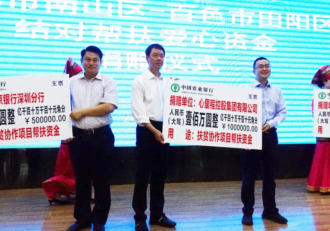 上還舉行了深圳市南山區(qū)結(jié)對幫扶百色市田陽區(qū)、德??h愛心資金捐贈和深圳市南山區(qū)—百色市田陽區(qū)、德保縣消費扶貧簽約儀式。心里程集團(tuán)分別向田陽區(qū)捐贈幫扶資金100萬元、向德??h捐贈幫扶資金200萬元。
